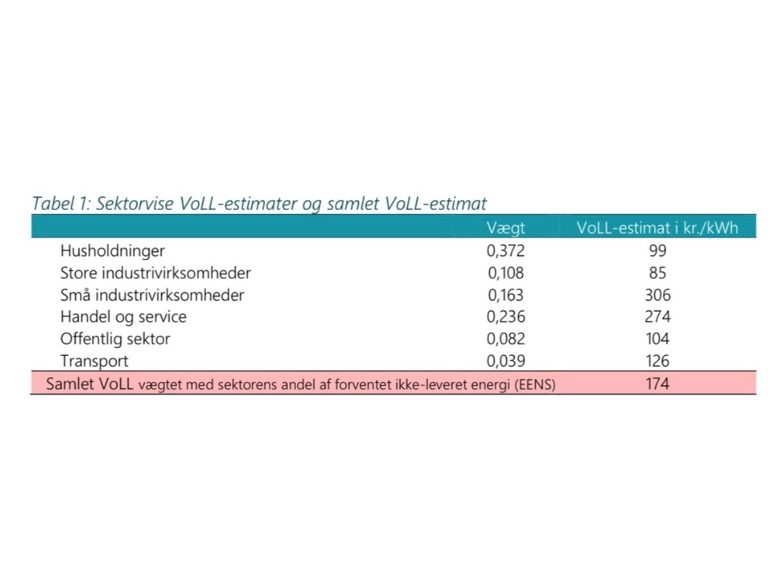 Se hovedtabellen fra Energistyrelsens opgørelse. Tabellen viser, hvad det koster samfundet (tab af arbejdspladser, skatteindtægter, etc), når 1 kWh ikke kan blive tilsluttet nettet – eller få adgang til el.
