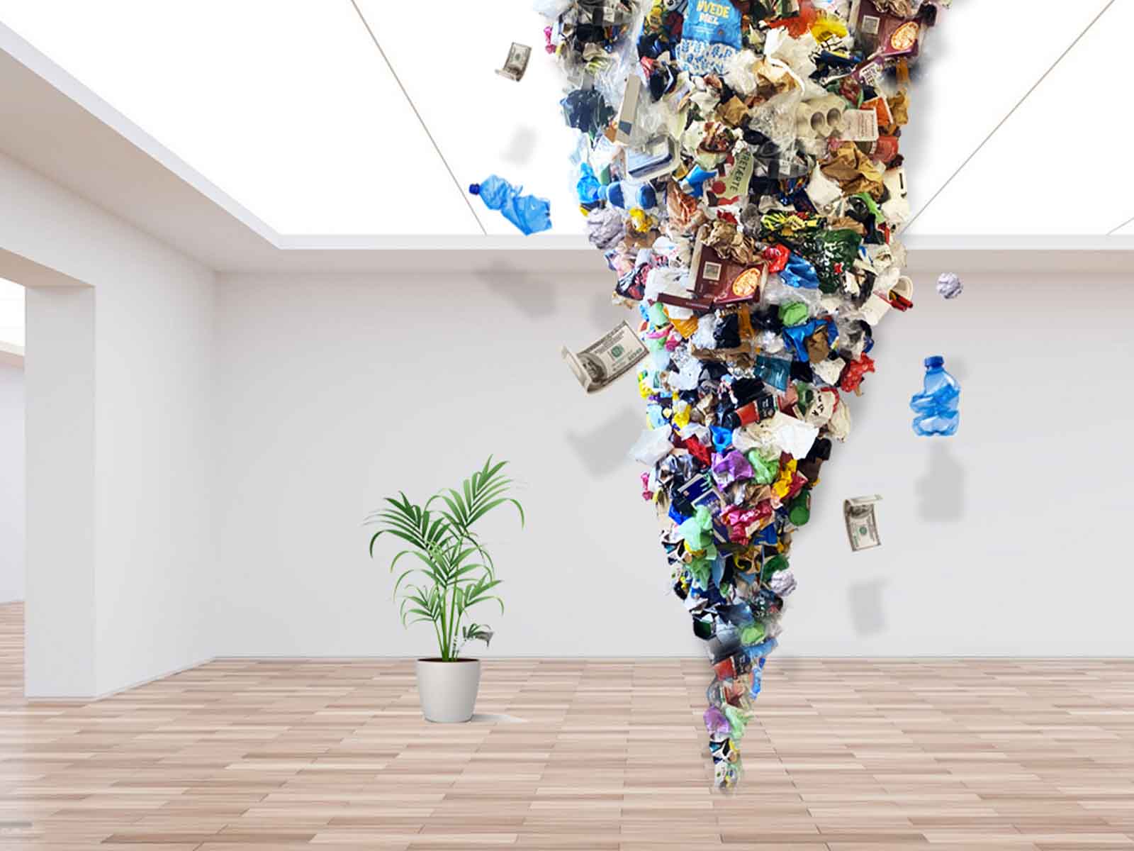 Her har kunstneren samlet sit eget husholdningsaffald for det, der svarer til en måned for at visualisere de store mængder husholdningsaffald, vi smider ud, der sætter sit aftryk på vind og vejr.